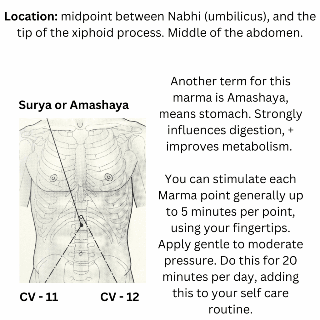 This marma technique is called Surya or Amashaya. Surya means the sun, the source of all heat, + fire. This marma represents the sun within us, (the solar plexus).